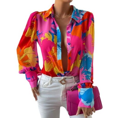 Button Down Shirts for Women Dressy Lantern Long Sleeve Blouses Printed Casual Loose Colorful Blouse Work Tops