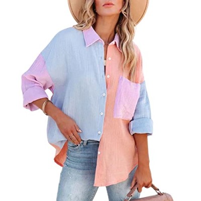 Women's Color Block Long Sleeve Button Down Boyfriend Shirt Blouses