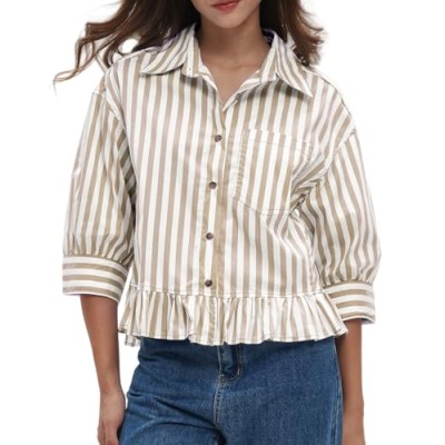 Womens Button Down Striped Shirts Peplum Ruffle Hem 3/4 Sleeve Casual Loose Babydoll Blouse Tops with Pocket