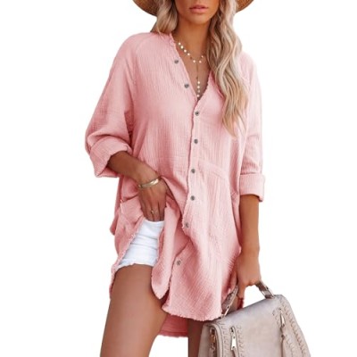 Women's Button Down Tunic with Pockets Cotton Gauze Button Up Shirt Dress V Neck Long Sleeve Frayed Blouse Tops
