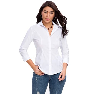 Womens Button Down Shirts Official Formal 3/4 Sleeve White Stretch Blouse Summer Dress Shirt