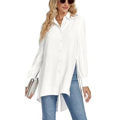 Women's Collar V Neck Split Hem Button Down Long Sleeve Long Shirt Blouse Tunic Top