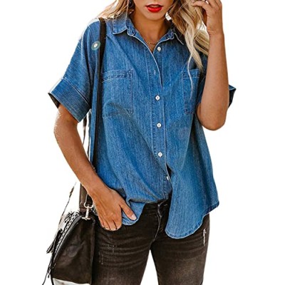 Women's Button Down Denim Shirt Casual Loose Short Sleeve Jean Shirts Tops with Pockets