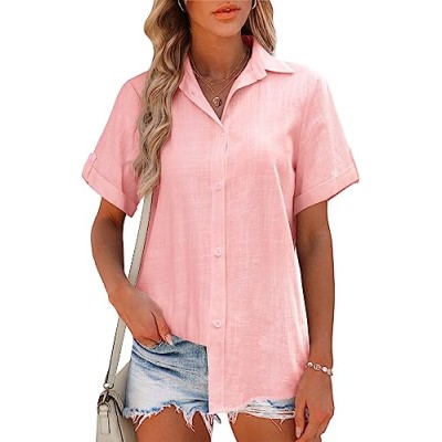 Button Down Shirt Women Cotton Short Sleeve Blouses V Neck Collared Button Up Summer Beach Tops