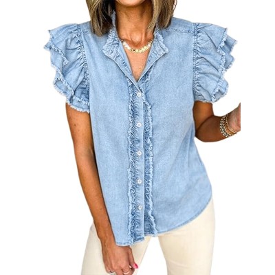 Summer Women's Button Down Denim Tops Ruffled Flutter Sleeve Blouse V Neck Casual Shirt Tops