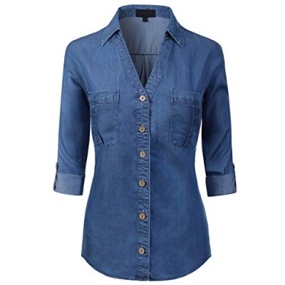 Women's Casual Basic Roll Up Sleeve Denim Chambray V-Neck Tencel Button Down Shirt